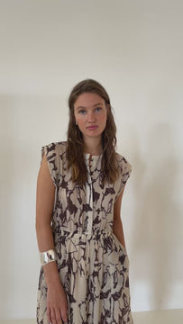 Midi dress in viscose gauze. Regular fit. Sleeveless with round neckline and flattering gathered waist. Terracotta floral print on a light background. Button front. Flowy drape. Lined skirt.