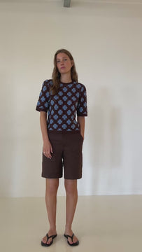 Chocolate linen Bermuda shorts. Regular fit and mid rise. Elastic waist at the back. Zip and button fastening. Belt loops. Two side pockets. Two decorative pockets in back.