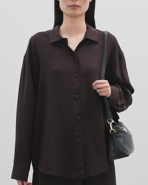 A stylish bag crafted from grained leather. Featuring an adjustable and removable shoulder strap, and adorned with a gold-plated sterling silver organic clasp. Can hold any mobile phone.